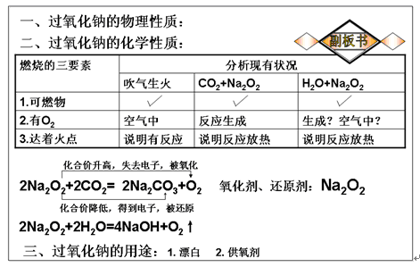以副板書展現(xiàn):如何通過燃燒的三要素來推知Na2O2與H2O、CO2的反應。