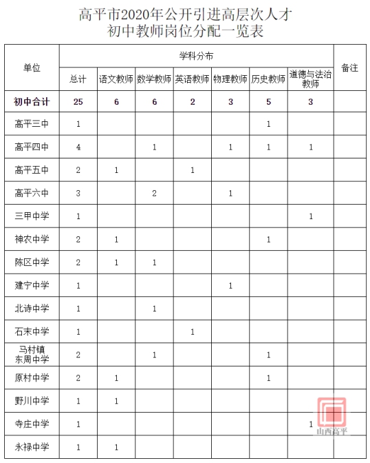 2.高平市2020年公開引進高層次人才初中教師崗位分配一覽表