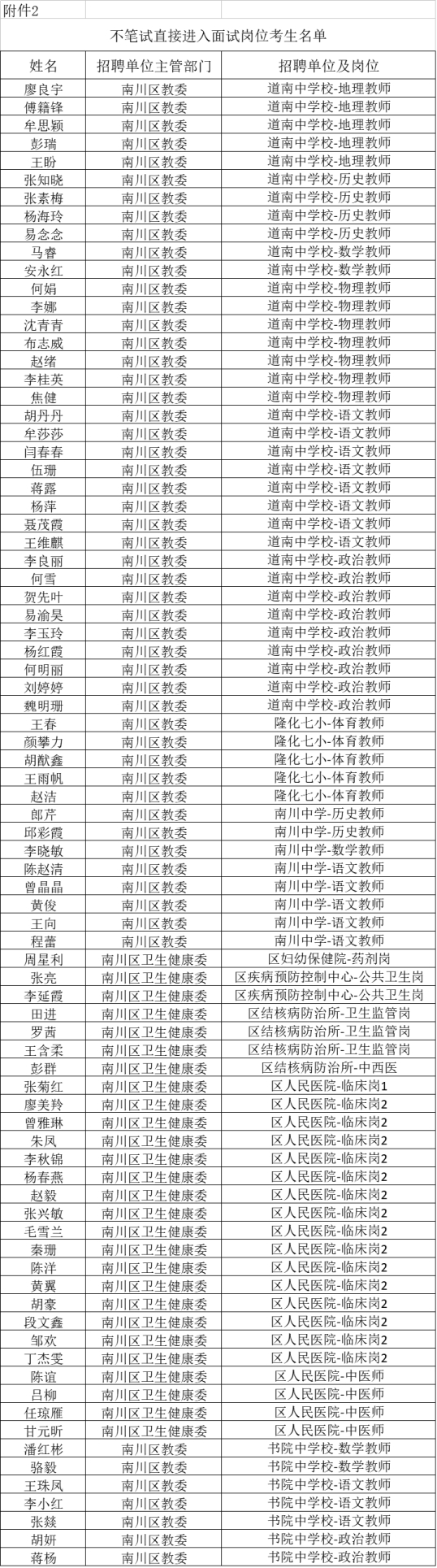 2.地點:報考區(qū)衛(wèi)生健康委所屬崗位考生資格復(fù)審地點在南川區(qū)衛(wèi)生健康委603室(組織人事科,咨詢電話:023-71648387);報考區(qū)教委所屬崗位的考生資格復(fù)審地點在南川區(qū)教師進修校(南川區(qū)委黨校)C幢階梯教室2(咨詢電話:023-81110585)。
