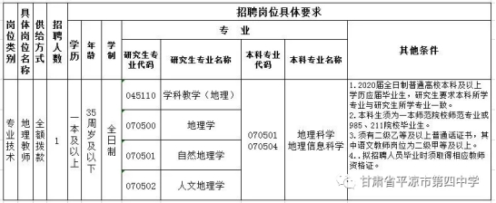 甘肅平涼市第四中學2020年公開招聘教師【1人】