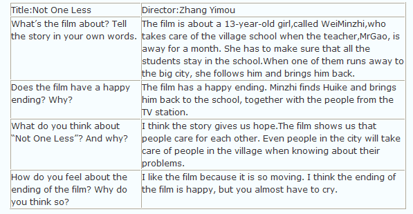 ② 通過閱讀影評(píng)《一個(gè)都不能少》,提高學(xué)生的讀、寫能力,熟悉并會(huì)使用電影評(píng)論的框架。