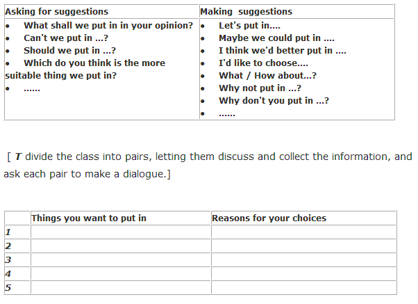 1. Language Input:Well, everybody is now asked to make a culture capsule with a size of 2×2 metres, which will be sent into space so that anyone who finds it will understand who we are. You can select five things that represent Chinese culture, but do remember that you cannot put any living things in it. Also you may include in the capsule a short message of about two sentences in any language, but remember that those who find it may not understand the language. Meanwhile please give the reasons for your choices. The following expressions may be helpful to you.