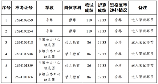 根據(jù)《云南省應(yīng)對(duì)新冠肺炎疫情影響大幅增加名額面向全國開展基礎(chǔ)教育學(xué)校專項(xiàng)招聘優(yōu)秀高校畢業(yè)生公告》等有關(guān)規(guī)定,進(jìn)入麻栗坡縣2020年專項(xiàng)招聘基礎(chǔ)教育學(xué)校教師面試前資格復(fù)審環(huán)節(jié)102人,經(jīng)復(fù)審,符合進(jìn)入面試環(huán)節(jié)95人。經(jīng)遞補(bǔ)及資格復(fù)審,符合進(jìn)入面試環(huán)節(jié)6人。符合進(jìn)入面試環(huán)節(jié)共101人,現(xiàn)將面試遞補(bǔ)人員名單公告如下: