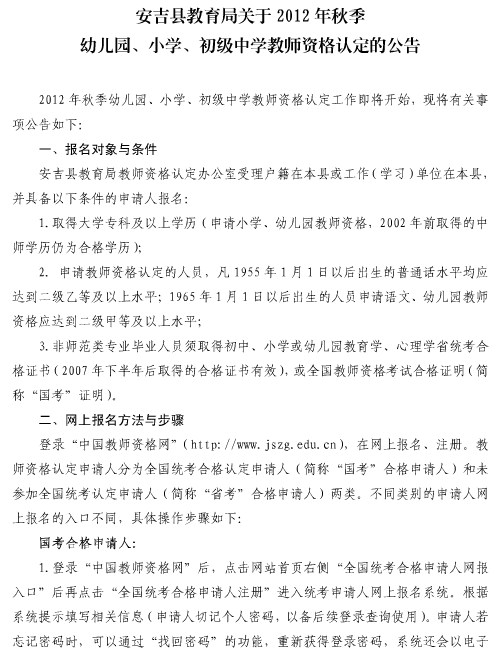 安吉縣教育局關(guān)于2012年秋季幼兒園、小學(xué)、初級(jí)中學(xué)教師資格認(rèn)定的公告