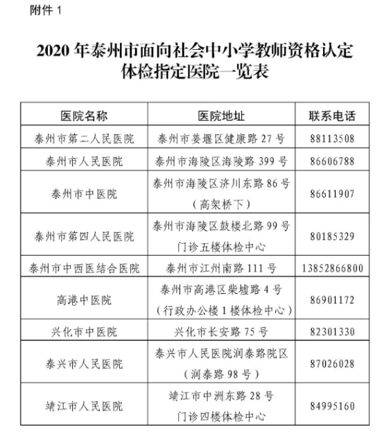1.2020年泰州市面向社會中小學教師資格認定體檢指定醫(yī)院一覽表