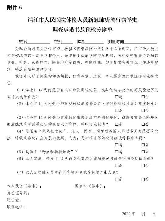 5.靖江市人民醫(yī)院體檢人員新冠肺炎流行病學史調查承諾書及預檢分診單