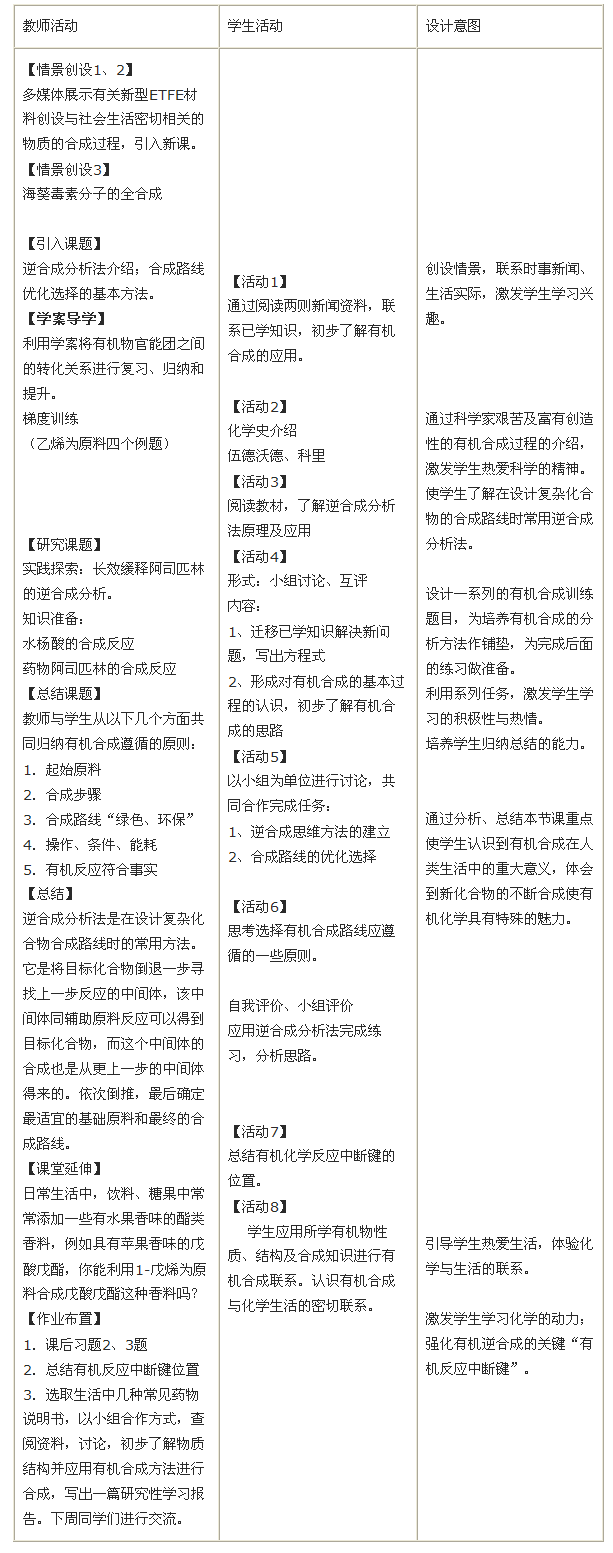 、谕ㄟ^與生活實際相關(guān)的有機物的合成方法的學(xué)習(xí),培養(yǎng)學(xué)生的逆合成分析法的邏輯思維能力以及信息遷移能力。