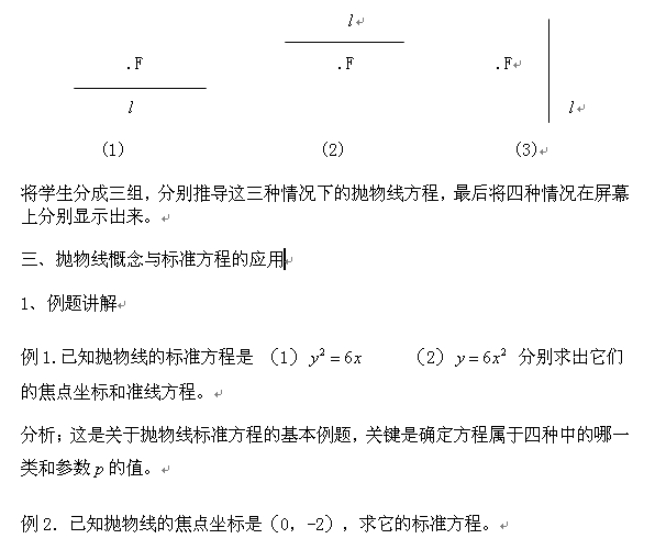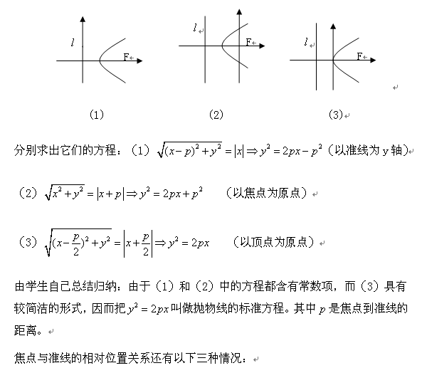 利用圓錐曲線第二定義通過類比方法,引導(dǎo)學(xué)生觀察和對比,啟發(fā)學(xué)生猜想與概括,利用建立坐標(biāo)系求出拋物線的四種標(biāo)準(zhǔn)方程,讓每一個學(xué)生都能動手,動口,動腦參與教學(xué)過程,真正貫徹“教師為主導(dǎo),學(xué)生為主體”的教學(xué)思想。對于標(biāo)準(zhǔn)方程中的參數(shù)及其幾何意義,焦點(diǎn)坐標(biāo)和準(zhǔn)線方程與的關(guān)系是本節(jié)課的重點(diǎn)內(nèi)容,必須讓學(xué)生掌握如何根據(jù)標(biāo)準(zhǔn)方程求、焦點(diǎn)坐標(biāo)、準(zhǔn)線方程或根據(jù)后三者求拋物線的標(biāo)準(zhǔn)方程。特別對于一些有關(guān)距離的問題,要能靈活運(yùn)用拋物線的定義給予解決。