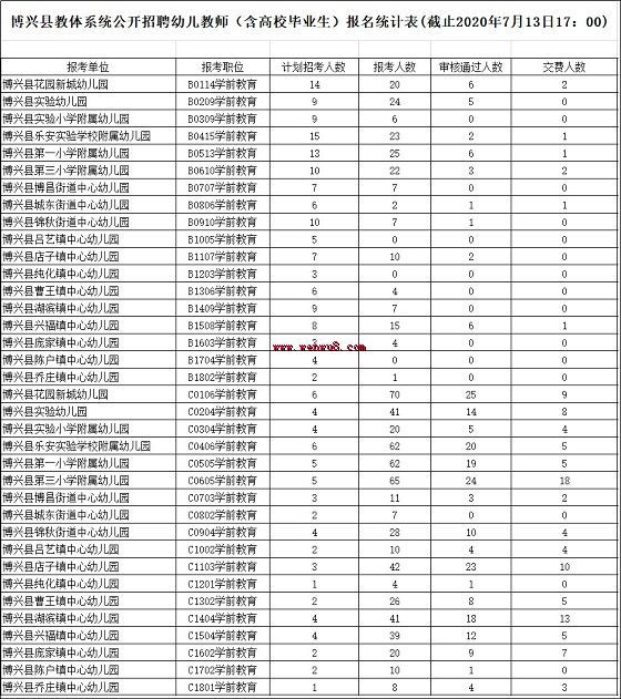 2020年山東濱州博興縣招聘幼兒教師(含高校畢業(yè)生)報(bào)名統(tǒng)計(jì)表(截止2020年7月13日17:00)