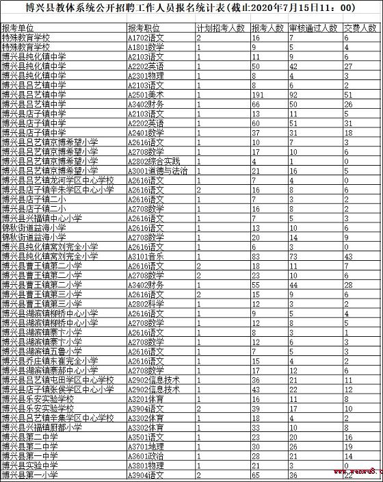 2020年山東濱州博興縣教體系統(tǒng)公開招聘工作人員報名統(tǒng)計表(截止2020年7月15日11:00)