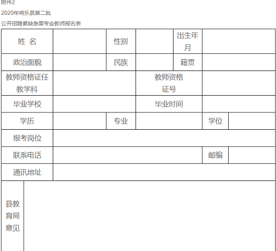 2.2020年將樂縣第二批公開招聘緊缺急需專業(yè)教師報(bào)名表