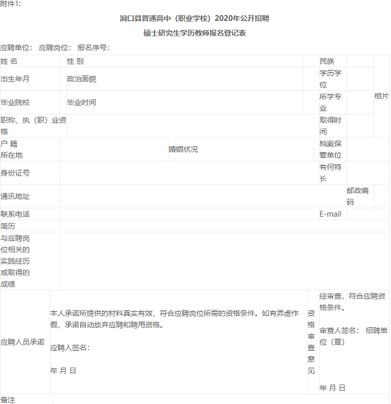 附件1:洞口縣普通高中(職業(yè)學(xué)校)2020年公開(kāi)招聘碩士研究生學(xué)歷教師報(bào)名登記表