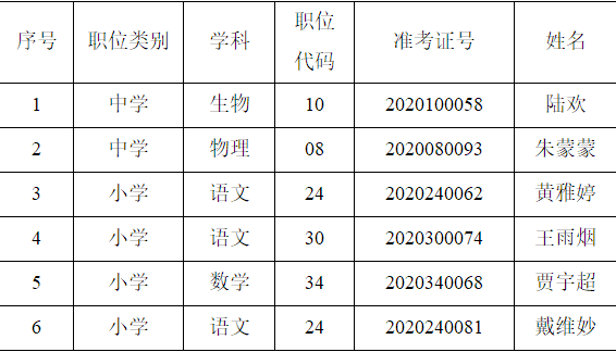 根據(jù)《2020年張家港市公開招聘事業(yè)編制教師簡章》“因考生體檢、政審不合格以及因自動放棄錄取資格而出現(xiàn)缺額時,按該崗位報考人員考試總成績從高分到低分進行遞補!钡南嚓P(guān)規(guī)定,現(xiàn)將遞補進入體檢人員名單公告如下: