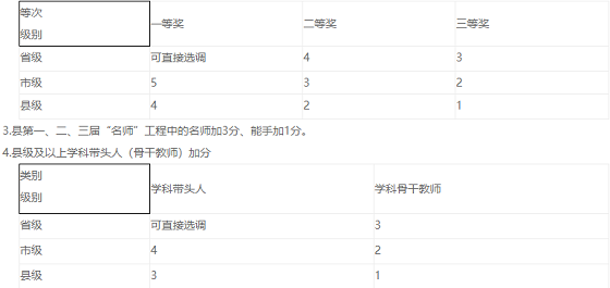 評優(yōu)評模和優(yōu)質(zhì)課競賽獲獎須為當(dāng)?shù)叵鄳?yīng)黨委、政府或教育主管部門頒發(fā)的證書,評優(yōu)評模、優(yōu)質(zhì)課競賽、“名師”工程、學(xué)科帶頭人(骨干教師)各計(jì)最高分1次。