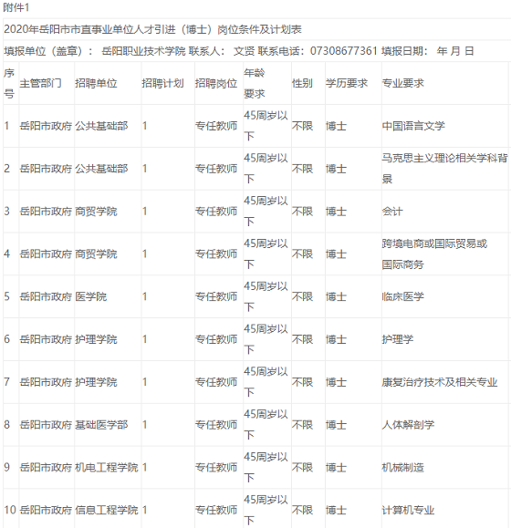 附件1:2020年岳陽市市直事業(yè)單位人才引進(jìn)(博士)崗位條件及計(jì)劃表