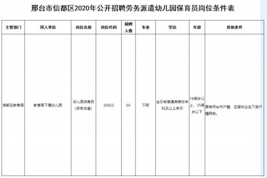 附件1:《邢臺(tái)市信都區(qū)2020年公開招聘勞務(wù)派遣幼兒園保育員崗位條件表》