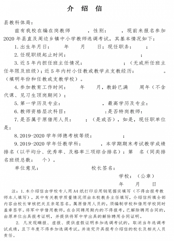 (2)單位介紹信(見(jiàn)附件2,用鋼筆如實(shí)填寫,其中有關(guān)教學(xué)質(zhì)量情況須由本校教務(wù)主任填寫,介紹信所填全部?jī)?nèi)容由校長(zhǎng)審核把關(guān)且親筆簽名,屬原借用人員的,須編制學(xué)校和借用學(xué)校同時(shí)蓋章簽字)。將軍中學(xué)借用教師,在合同聘用期內(nèi)的不得報(bào)考,已解除聘用合同的,由原單位出具報(bào)考證明,并提供將軍中學(xué)出具的解除聘用合同證明。