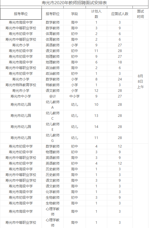 其他崗位從南門進(jìn)入,到東側(cè)高小部教學(xué)樓一樓東頭合班教室集合。詳情見附件《壽光市2020年教師招聘面試安排表》。