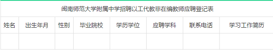 報(bào)名方式:請有應(yīng)聘意向的教師請復(fù)制以下閩南師范大學(xué)附屬中學(xué)招聘以工代教非在編教師應(yīng)聘登記表為Excel文檔,填寫完整后,統(tǒng)一發(fā)電子郵件到指定郵箱zzez0596@163.com,郵件名稱請注明“姓名及應(yīng)聘學(xué)科”。
