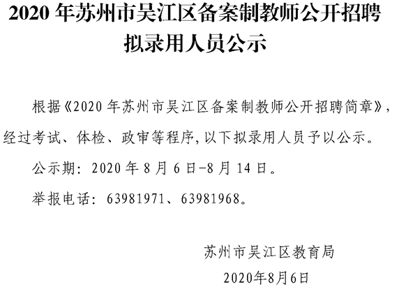 2020年蘇州教師招聘 蘇州市吳江區(qū)備案制教師公開招聘擬錄用人員公示