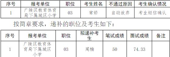 按照《2020年6月?lián)P州市廣陵區(qū)教育系統(tǒng)事業(yè)單位公開招聘教師簡章》要求,截至目前,在考察中,有1名考生確認(rèn)放棄,具體如下: