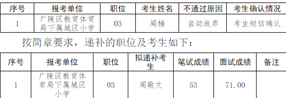 按照《2020年6月?lián)P州市廣陵區(qū)教育系統(tǒng)事業(yè)單位公開招聘教師簡章》要求,截至目前,在考察中,有1名考生確認(rèn)放棄,具體如下: