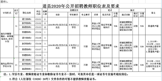 附件1:道縣2020年公開補充招聘教師職位表及要求