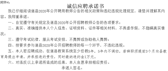 (一)誠信考試。報考人員需向縣教育局遞交誠信承諾書,誠信參與考試聘用的各個環(huán)節(jié),不弄虛作假,不違紀違規(guī)。