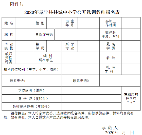 附件1:2020年縣城中小學(xué)公開選調(diào)教師報名表