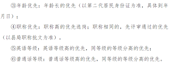 ③錄用順序。各學(xué)科擬選調(diào)人員確定后,分別按中、小學(xué)報考人員的總分排序,依次選崗(參與頂崗選調(diào)的人員除外)。