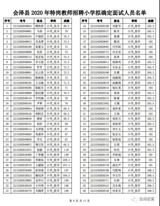 附件:會(huì)澤縣2020年特崗教師招聘中(。⿲W(xué)擬確定面試人員名單