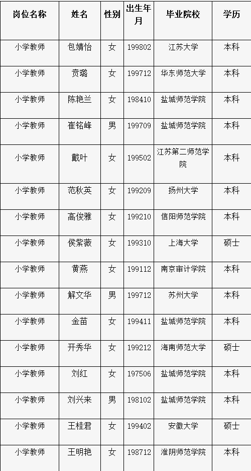 根據(jù)《華東師范大學(xué)蘇州灣實(shí)驗(yàn)小學(xué)2020年招聘公告》、《華東師范大學(xué)蘇州灣實(shí)驗(yàn)小學(xué)2020年招聘2名語文骨干教師公告》,經(jīng)過筆試、面試、體檢和政審合格,擬錄用以下23名同志,現(xiàn)公示如下: