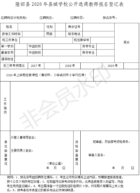 (2)報(bào)名人員自行下載填寫《隆回縣2020年縣城學(xué)校公開(kāi)選調(diào)教師報(bào)名登記表》(附表六)。本縣教師報(bào)考的,由編制所在鄉(xiāng)鎮(zhèn)中心學(xué)校或縣直學(xué)校審查報(bào)名條件,經(jīng)分管人事負(fù)責(zé)人和主要負(fù)責(zé)人簽字確認(rèn)后,加蓋單位公章;在編在崗年限由縣教育局檔案室查檔確認(rèn)。縣外教師報(bào)考的,需原單位縣級(jí)教育行政主管部門簽具同意報(bào)考證明。