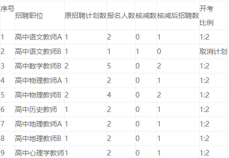 根據(jù)報名情況和事業(yè)單位公開招聘有關(guān)規(guī)定,經(jīng)寧遠縣2020年公開招聘教師工作領(lǐng)導(dǎo)小組同意,并報人社部門審批,2020年我縣第三中學(xué)自主招聘教師下列部分職位擬按1:2的比例開考,對未達到筆試最低開考比例的職位核減或取消招聘計劃,具體情況如下: