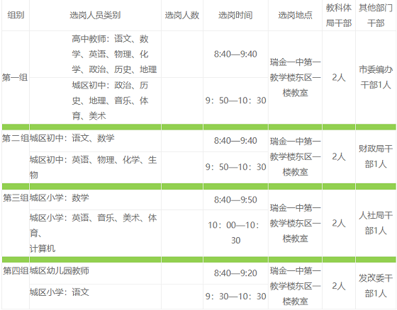 請(qǐng)選崗人員于8月20日上午按下表分組安排,帶好本人身份證,提前20分鐘到瑞金一中第一教學(xué)樓東區(qū)一樓教室參加選崗。