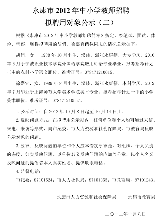 2012年浙江省金華永康市中小學(xué)教師招聘擬聘用對(duì)象公示二
