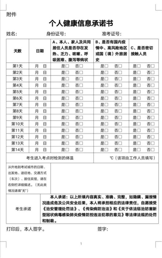 (6)筆試準(zhǔn)考證打印:將視新冠肺炎疫情防控情況,提前在報(bào)名網(wǎng)站(http://www.hebrpo.com)、隆堯人社微信公眾號另行公告,請報(bào)名成功者予以關(guān)注,并按公告明確的時(shí)間打印準(zhǔn)考證,逾期者責(zé)任自負(fù)。按目前疫情防控有關(guān)要求,考生須提前14天通過微信小程序申領(lǐng)“河北健康碼"(現(xiàn)在應(yīng)申領(lǐng)),考試當(dāng)天“河北健康碼”為綠碼且經(jīng)現(xiàn)場測量體溫低于37.3°C,并無干咳等異常癥狀的,方可進(jìn)入考點(diǎn)參加考試。結(jié)合疫情防控形勢,報(bào)名網(wǎng)站、隆堯人社微信公眾號還將在考前發(fā)布考試實(shí)施具體防控要求,報(bào)考人員務(wù)必及時(shí)關(guān)注并遵照執(zhí)行。打印筆試準(zhǔn)考證時(shí),考生還需同時(shí)下載打印填寫《個(gè)人健康信息承諾書》。筆試時(shí),考生須持二代居民身份證、《筆試準(zhǔn)考證》和《個(gè)人健康信息承諾書》(附件2),方能進(jìn)入考場。凡不實(shí)承諾、隱瞞病史、旅行史、接觸史、逃避防疫措施,造成嚴(yán)重后果的,將依法依規(guī)追究責(zé)任。