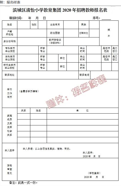 1、報(bào)名。符合報(bào)名條件的請(qǐng)到郵箱qyxx3096122@163.com(密碼bgs207)下載《濱城區(qū)清怡小學(xué)教育集團(tuán)2020年招聘教師報(bào)名表》,填寫(xiě)后,將報(bào)名表發(fā)送至學(xué)校郵箱:bcqqyxx@163.com。