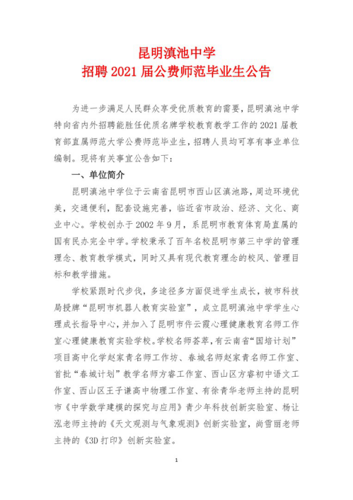 昆明滇池中學(xué)招聘2021屆公費師范畢業(yè)生公告