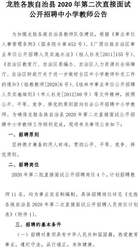 2020年桂林教師招聘 廣西桂林龍勝各族自治縣第二次直接面試公開(kāi)招聘中小學(xué)教師【11人】