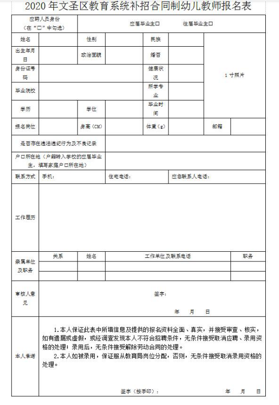 報名者本人持有效身份證、戶口本、畢業(yè)證、相關(guān)資格證的原件和復(fù)印件以及學(xué)信網(wǎng)學(xué)歷證明和《招聘報名表》(附件1),近期同版免冠一寸彩色白底照片3張,報名時間3天,報名日期為2020年8月31日至2020年9月2日上午:9:00-11:00,下午13:30-16:00止,逾期不予辦理。