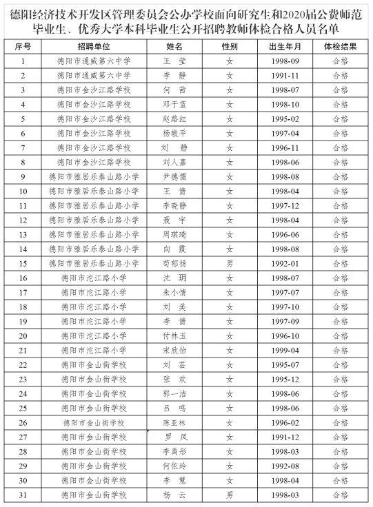 四川德陽經(jīng)濟技術(shù)開發(fā)區(qū)2020年公辦學校面向研究生和公費師范生、優(yōu)秀本科畢業(yè)生公開招聘教師體檢合格人員公示