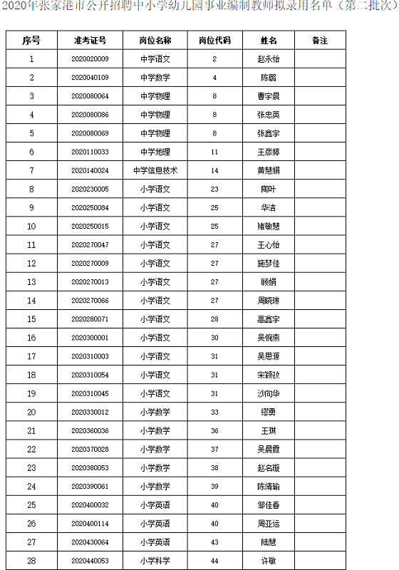 附件:2020年張家港市公開招聘中小學幼兒園事業(yè)編制教師擬錄用名單(第二批次)