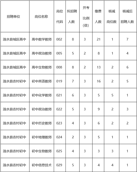 2020年漣水縣公開招聘教師報名工作已結(jié)束。因城區(qū)高中數(shù)學(xué)教師等10個崗位(詳見下表)通過資格審查、確認繳費的報考人數(shù)未達到開考比例,根據(jù)《2020年漣水縣公開招聘教師公告》規(guī)定,核減相關(guān)崗位的招聘計劃,F(xiàn)將本次招聘核減崗位情況公告如下: