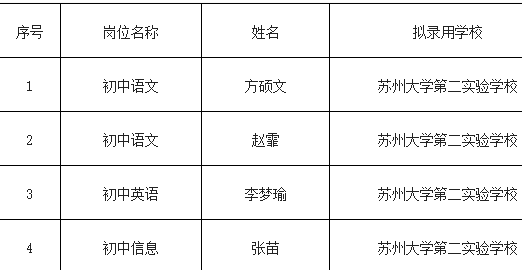 根據(jù)《2020年蘇州大學(xué)第二實(shí)驗(yàn)學(xué)校補(bǔ)充招聘年金制教師簡章》規(guī)定,經(jīng)公開報(bào)名、筆試、面試、政審、體檢等程序,擬錄用以下4位同志為相城區(qū)年金制教師,公示時(shí)間為7個(gè)工作日(9月1日—9月9日)。