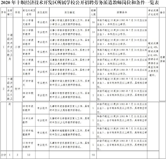 《十堰經(jīng)濟技術開發(fā)區(qū)所屬學校招聘中小學教師公告》發(fā)布后,經(jīng)初步資格審查,部分崗位無人報名。為保證本次崗位招聘考試順利進行,根據(jù)教學工作需要和招聘單位要求,經(jīng)研究同意,決定將原公告中“10、12、13、14”崗位及招聘人數(shù)全部調整為“07”,其他條件不變(詳見《2020年十堰經(jīng)濟技術開發(fā)區(qū)所屬學校公開招聘勞務派遣教師崗位和條件一覽表》)。