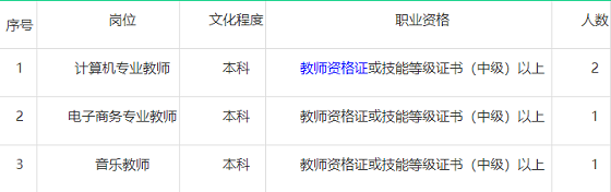 招聘4人,計(jì)算機(jī)專業(yè)教師2名,電子商務(wù)專業(yè)教師1人,音樂教師1人。要求“文化程度”或“職業(yè)資格”其中一項(xiàng)達(dá)標(biāo)即可,具體見下表: