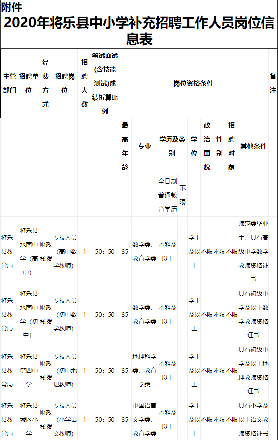 以上崗位和專業(yè)要求詳見(jiàn)附件1《2020年將樂(lè)縣中小學(xué)新任教師補(bǔ)充招聘崗位信息表》。