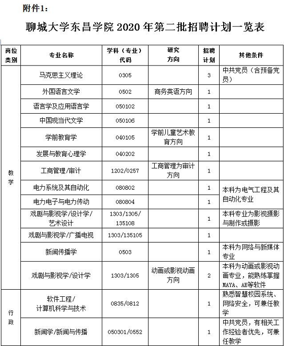 詳見《聊城大學(xué)東昌學(xué)院2020年第二批招聘計(jì)劃一覽表》(附件1)。