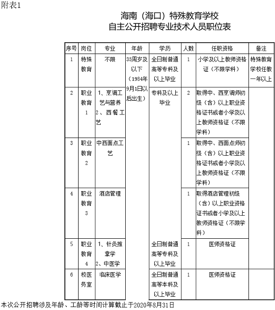 1、海南(?冢┨厥饨逃龑W(xué)校2020年自主公開招聘專業(yè)技術(shù)人員職位表